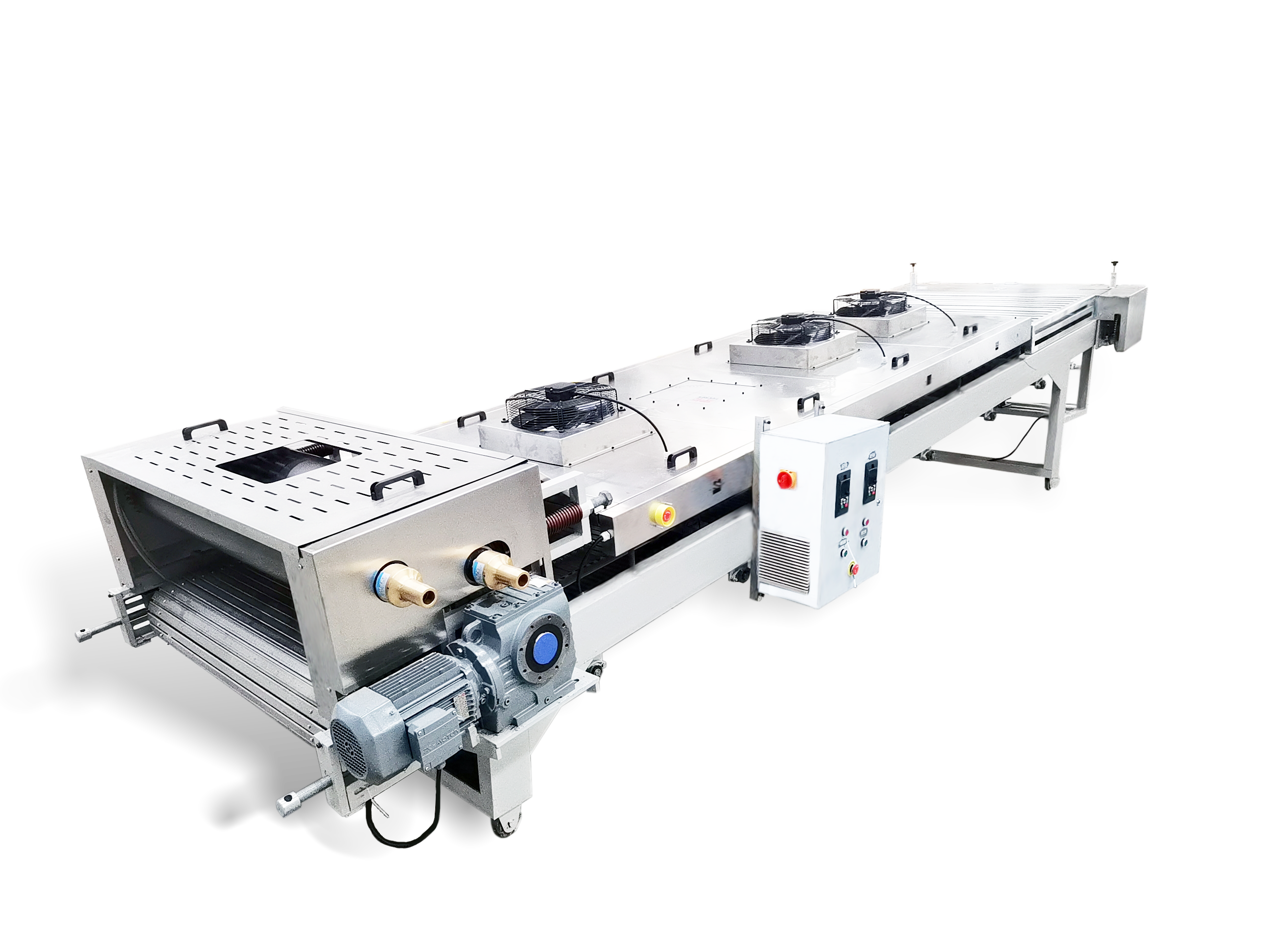 YPJ系列不銹鋼鏈板壓片機(jī)由冷卻壓輥、不銹鋼節(jié)片輸送帶、破碎和風(fēng)冷系統(tǒng)組成。擠出機(jī)擠出的熱熔融狀物料經(jīng)冷卻壓輥壓成 1-2mm 片狀,在不銹鋼節(jié)片輸送帶上風(fēng)冷至常溫,破碎成片狀物料排出。可選配有空氣過(guò)濾,冷熱交換系統(tǒng)。